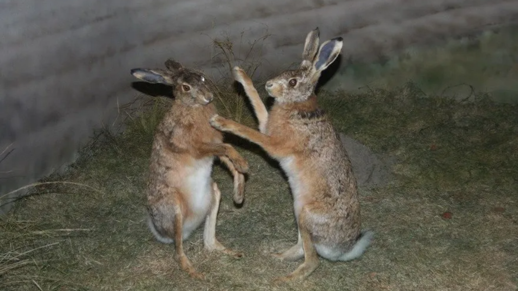 Hasen sind eigentlich friedliche und scheue Tiere. Nur wenn sie sich paaren wollen, kommt es zwischen männlichen Hasen zu Kämpfen. Sie stehen dabei aufrecht und trommeln mit den Vorderpfoten aufeinander ein. Das sieht wie ein Boxkampf aus.