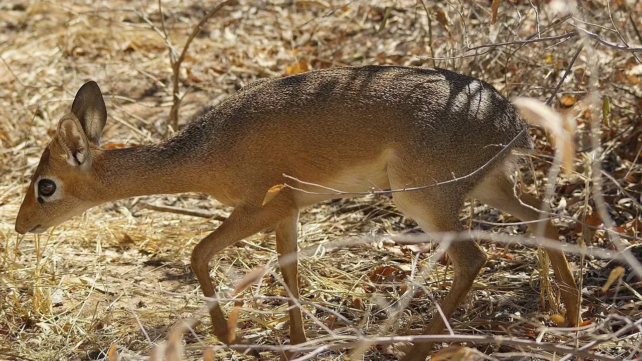 Die Dikdik gehören zu den Antilopen. Sie sind aber nur etwa 35 cm groß, also etwas größer als unsere Hasen. Sie wiegen ungefähr 3 bis 7 kg. Die männlichen Tiere tragen kurze Hörner.
