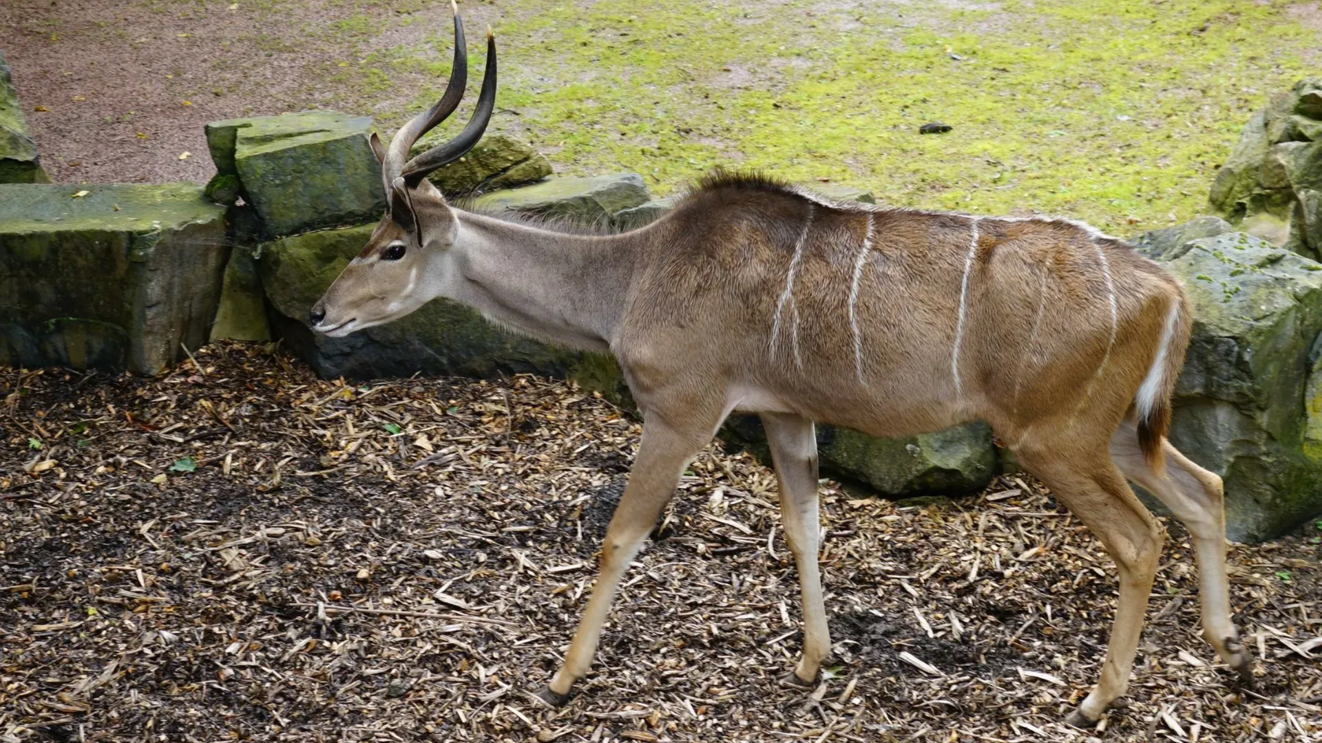Das Fell der Kudus ist hellgrau, auf dem Rücken tragen Kudus einen weißen Längsstreifen und mehrere Querstreifen. Die Männchen haben Hörner in Form von Spiralen.