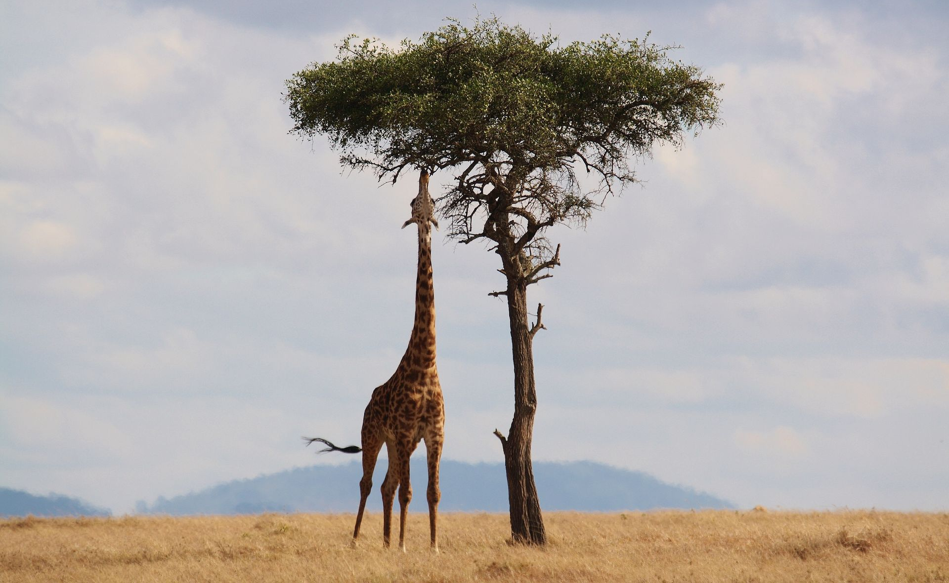 Eine Giraffe gelangt hoch hinaus, hier in einem Nationalpark in Kenia