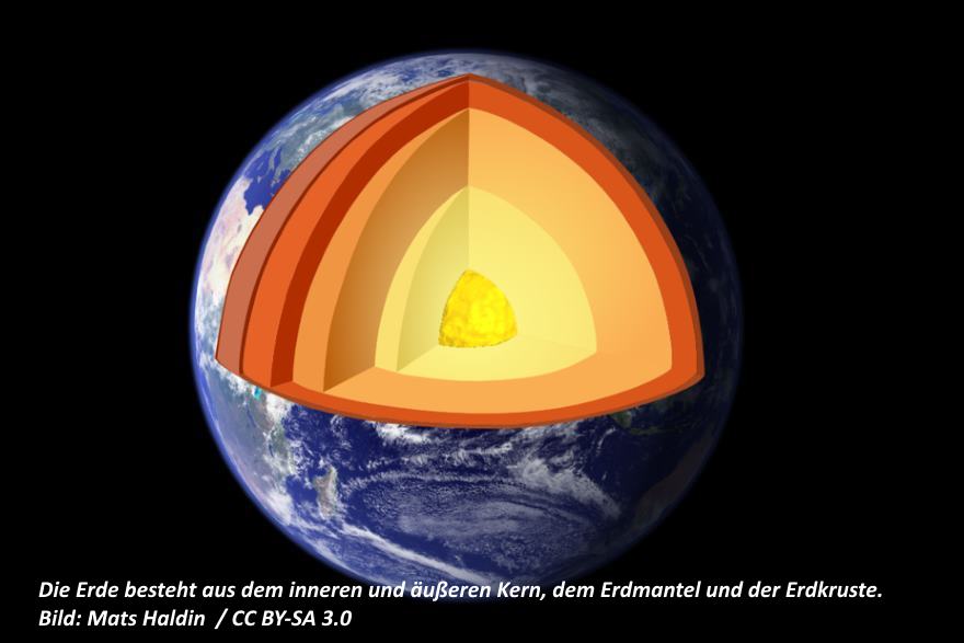 In einer Tiefe von etwa 2900 km herrscht eine Temperatur von ungefähr 3000 °C. Hier geht der Erdmantel in den Erdkern über. Wir unterscheiden den inneren und den äußeren Erdkern. Diese Schichten bestehen aus geschmolzenem Eisen und Nickel. Die Temperatur steigt im Erdkern auf bis zu etwa 4700 °C an.