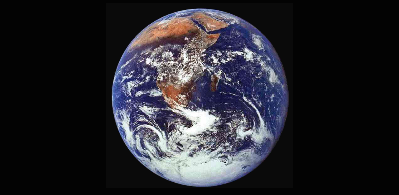 Irgendwo auf dieser Kugel leben wir, mit uns alle anderen Menschen, alle Tiere und Pflanzen. Wir erkennen Afrika, Arabien und die Antarktis. Am oberen linken Rand ist das Mittelmeer zu sehen. Die großen blauen Flächen sind Ozeane. Über weiten Teilen schweben Wolken.