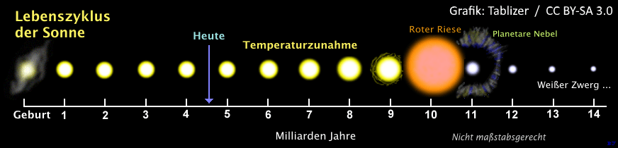 Seit Anbeginn der Sonne wird Wasserstoff in Helium umgewandelt. Irgendwann jedoch wird der Vorrat an Wasserstoff verbraucht sein. Dann wird sich die Sonne zunächst zu einem "Roten Riesen" ausdehnen. Die Sonne bedeckt in dieser Phase, von der Erde aus betrachtet, den größten Teil des Himmels. Leben wird in diesem Stadium auf der Erde schon lange nicht mehr möglich sein.