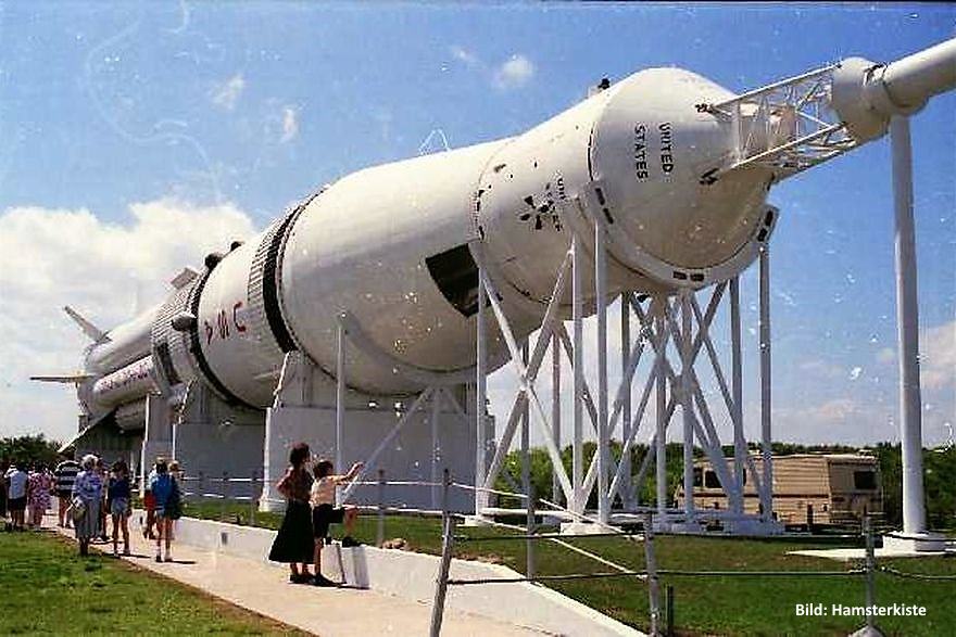 Um zwei Menschen auf den Mond und wieder zurück zu bringen, war ein großer Aufwand nötig. Die Amerikaner hatten dazu eine gewaltige Rakete entwickelt, von der nur wenige Exemplare gebaut wurden. Man nannte sie "SATURN V". Sie war insgesamt 110,6 m hoch.