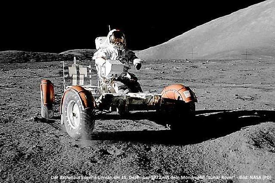 Mit dem Flug "Apollo 17" endeten im Dezember 1972 die bemannten Flüge zum Mond vorerst. Außer "Apollo 13" waren alle erfolgreich. Bisher betraten also 12 Menschen den Boden des Mondes. Einige der Astronauten fuhren sogar mit einem "Mondmobil" auf dem Erdtrabanten herum. Es wurde von einem Elektromotor angetrieben und erreichte eine Geschwindigkeit von 18 km/h.