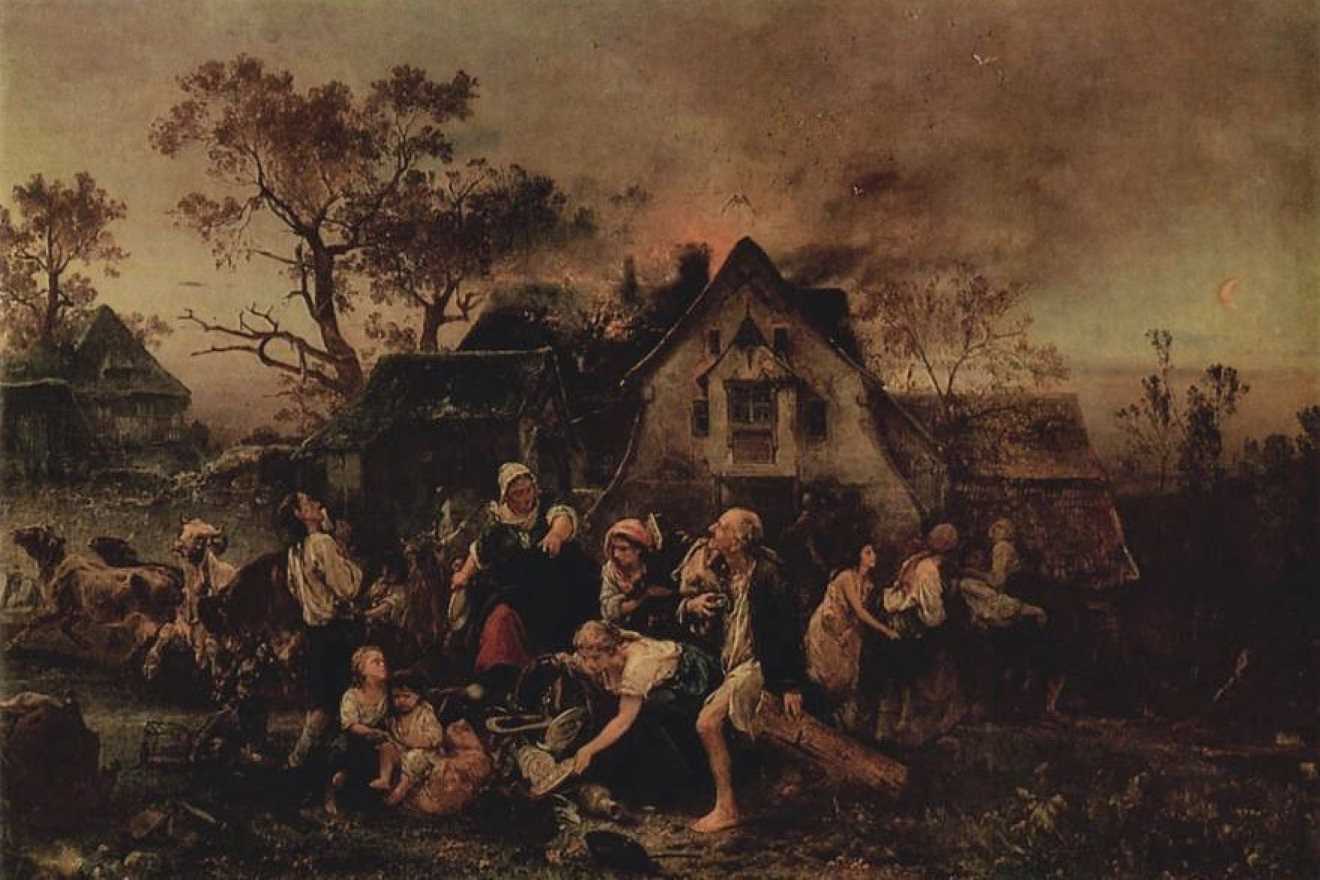 Der Maler Ludwig Knaus hat im Jahr 1854 ein Bild gemalt. Es trägt den Titel "Feuer im Dorf". Darauf sieht man, wie Menschen voller Angst versuchen, sich selbst, ihre Tiere und ihr Hab und Gut vor dem Feuer zu retten. Es herrscht Panik und das Feuer droht alles zu verschlingen.
