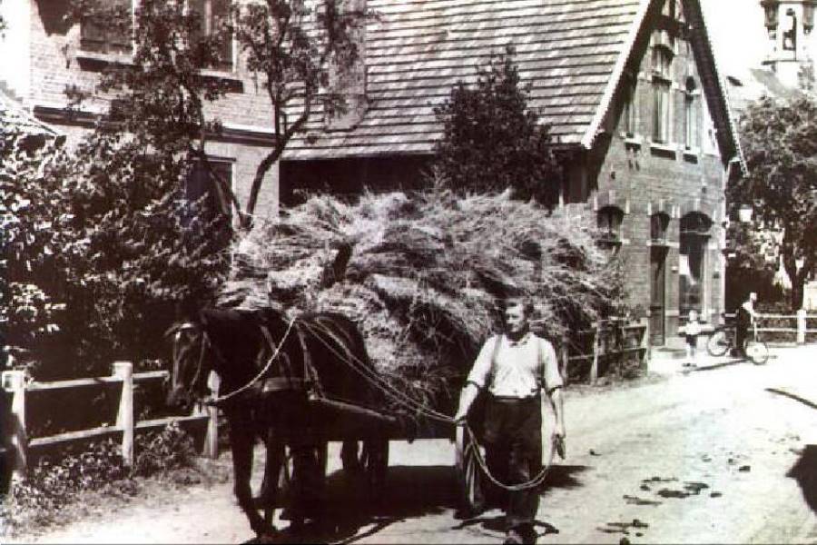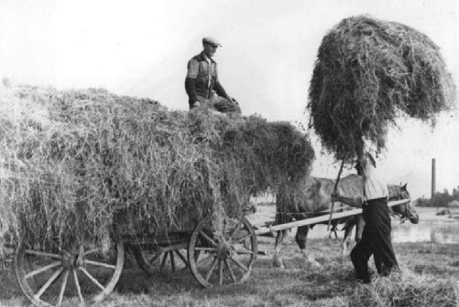 In dieser Zeit wurde es mehrfach gewendet. Das geschah in Handarbeit oder mit Heuwendern, die von Pferden gezogen wurden. Wenn das Gras zu Heu getrocknet war, fuhr man es mit einem Leiterwagen zum Hof und lagerte es auf dem Speicher. Es gab eine Haupternte im Frühsommer und manchmal noch eine zweite Ernte im Spätsommer.