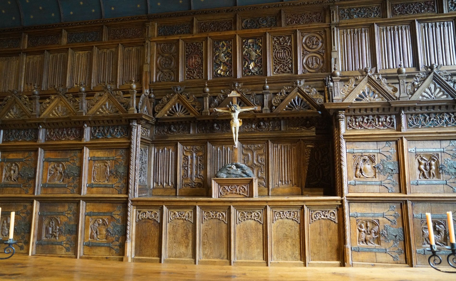 Die Wände des Saals sind mit Holz vertäfelt, an der Stirnseite befindet sich eine Figur des gekreuzigten Jesus