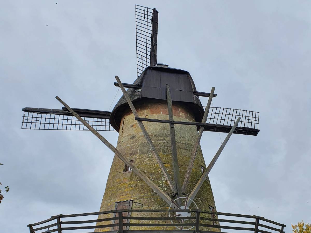 Die Windmühle steht noch heute und ist ungefähr 13 Meter hoch. Der Wind drehte ihre vier Flügel, die mit Stoff bespannt waren, um die Kraft des Windes besser ausnutzen zu können. Im Inneren befand sich eine graue Flügelwelle und ein großes Rad aus Holz, das man Kammrad nennt. Die Flügelwelle ragte mit ihrem Kopf aus der Mühlenkappe heraus und nahm die Kräfte von den Flügeln auf.