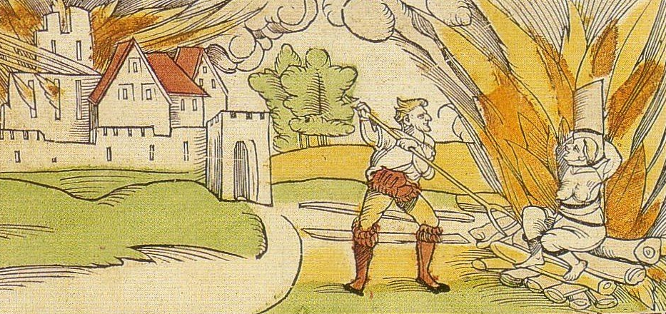 Bild auf einem Flugblatt aus dem Jahr 1533. In diesem Jahr verbrannten alle Häuser des Ortes Schiltach (bei Freiburg). Den Brand sollte eine Magd gelegt haben, der man vorwarf, sie stehe mit dem Teufel im Bunde. Sie wurde bei lebendigem Leibe verbrannt.