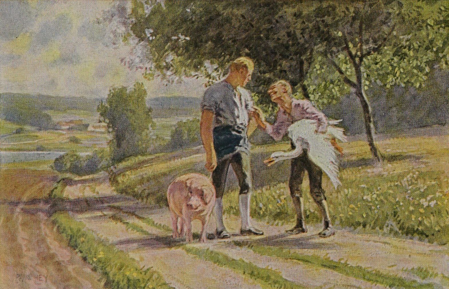 Der Bursche nahm das Seil in die Hand und trieb das Schwein schnell auf einem Seitenweg fort. Hans aber wanderte mit der Gans unter dem Arme seinem Heimatdorf entgegen. Er dachte dabei schon an den fetten Gänsebraten und an die Federn, aus denen ihm seine Mutter bestimmt ein neues Kopfkissen machen würde.