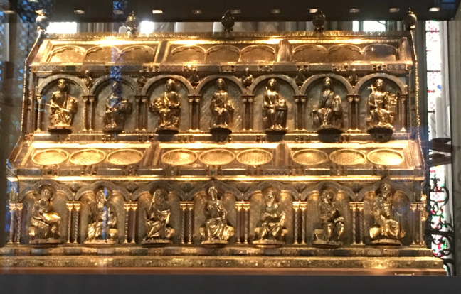 8 - Der kunstvoll geformte Schrein mit den Gebeinen der Heiligen Drei Könige steht direkt hinter dem Altar. Dieser Dreikönigsschrein ist 2,20 Meter lang, 1,10 Meter breit und 1,53 Meterhoch. Er ist mit 74 Figuren besetzt und mit über 1000 Edelsteinen und Perlen verziert. Goldschmiede brauchten einst 40 Jahre, bis sie dieses Werk geschaffen hatten.