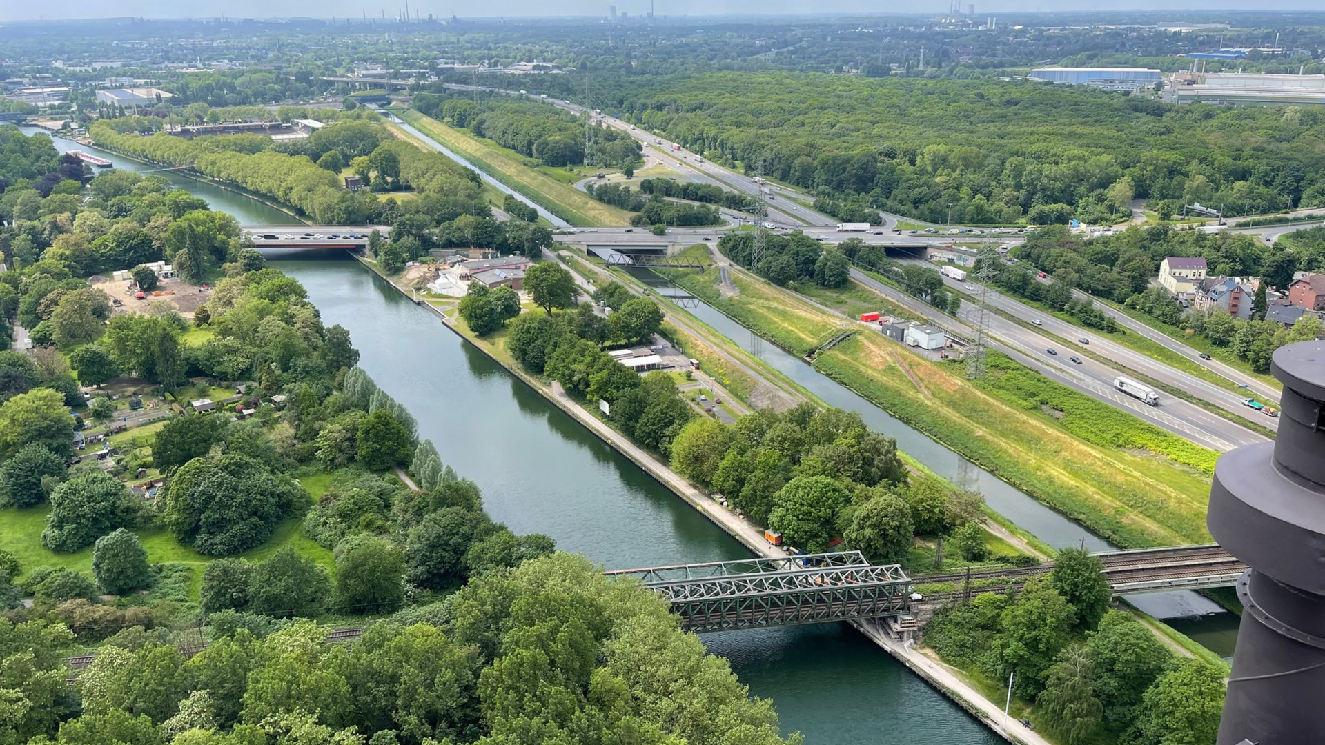 Blick vom Gasometer in Oberhausen auf die Emscher (rechts) und den Rhein-Herne-Kanal (links)