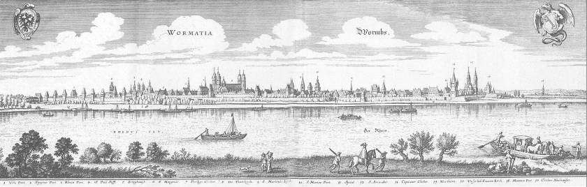 Dieser alte Stich zeigt den Rhein bei Worms (von Mathäus Merian dem Jüngeren 1655)