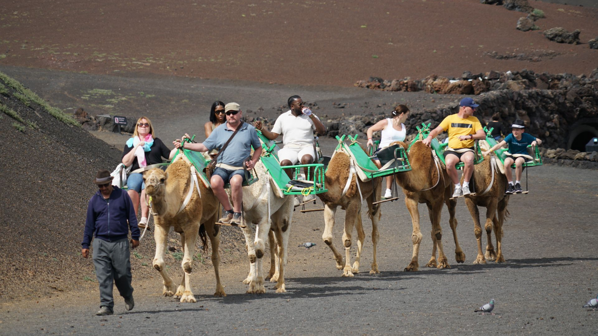 Touristen reiten auf Kamelen auf der Insel Lanzarote