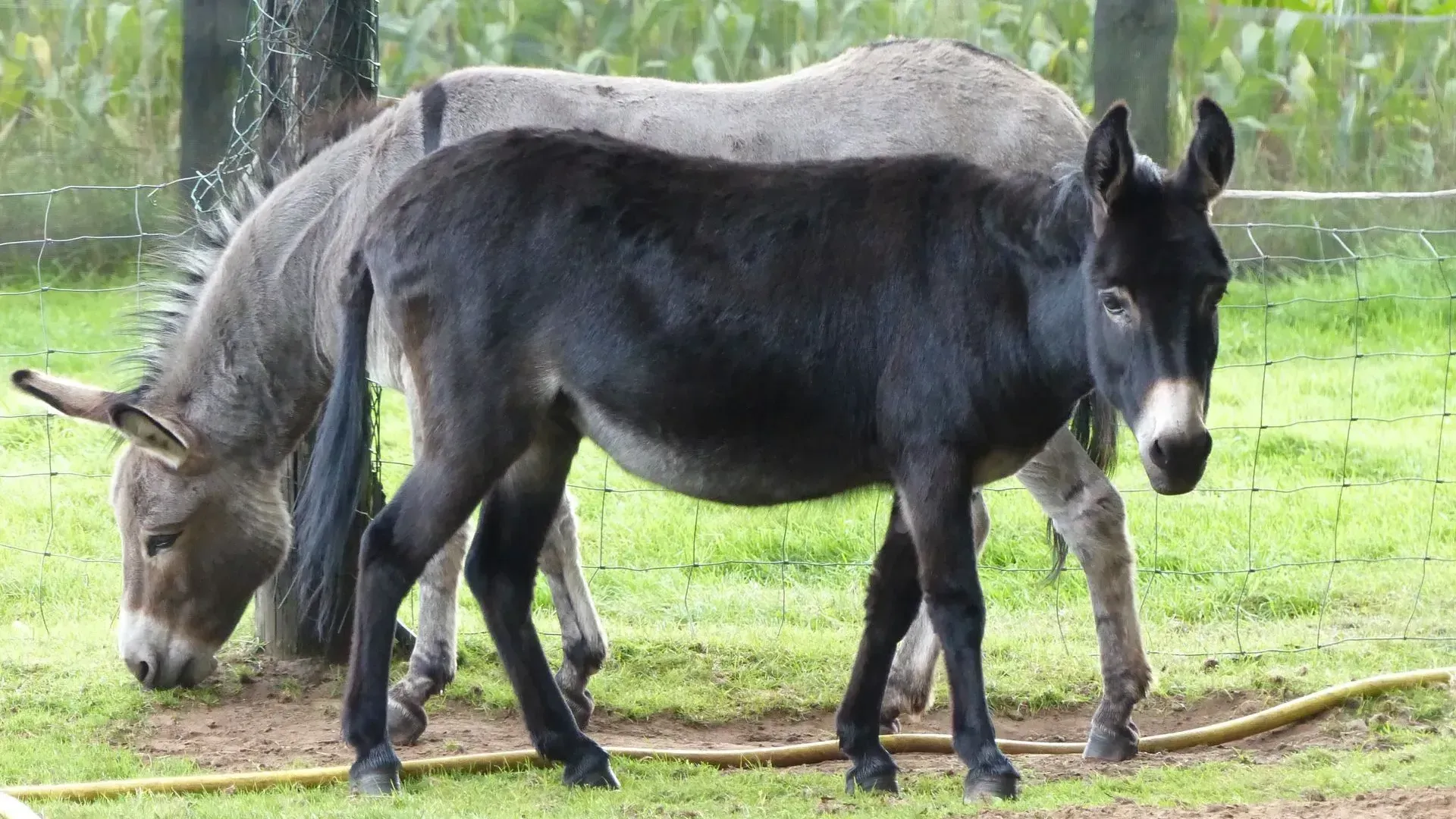 Die Esel auf dem Bild werden als Poitou-Esel bezeichnet. Sie haben ihren Namen nach dem Gebiet Poitou im Westen Frankreichs, wo sie seit Hunderten von Jahren vor allem in der Arbeit auf den Feldern eingesetzt wurden. Diese Tiere werden ungefähr 1,30 bis 1,50 m groß. Sie haben ein langes, zottiges Fell. Es ist meistens schwarzbraun.