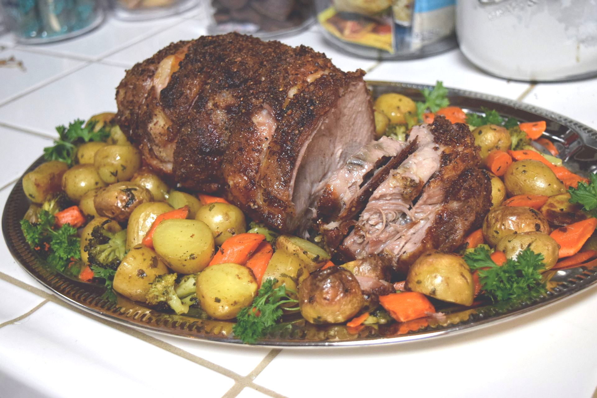 Ein Braten aus Schweinefleisch, angerichtet mit Kartoffeln und Gemüse