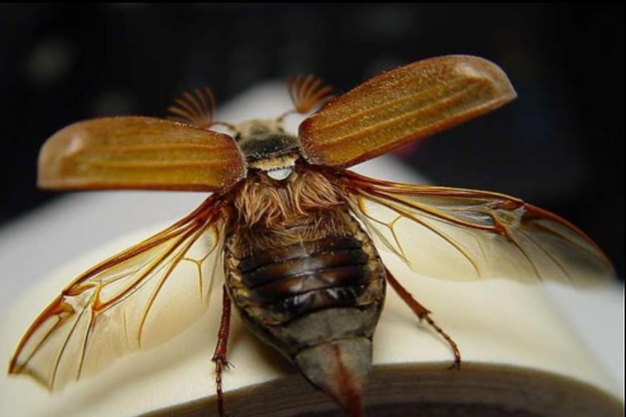 Maikäfer können leicht von Blatt zu Blatt krabbeln. Wenn sie allerdings von einem Baum auf einen anderen gelangen wollen, dann fliegen sie. Maikäfer verfügen dazu über eine besondere Ausstattung. Unter ihren braunen Deckflügeln verbirgt sich nämlich noch ein weiteres Flügelpaar. Wenn Maikäfer fliegen wollen, pumpen sie zuerst ihre Körperzellen mit Luft auf. Sie öffnen dann die Deckflügel. Diese dienen beim Flug als Tragfläche. Die weichen Unterflügel beginnen nun heftig zu schwingen und sorgen für den nötigen Antrieb.
