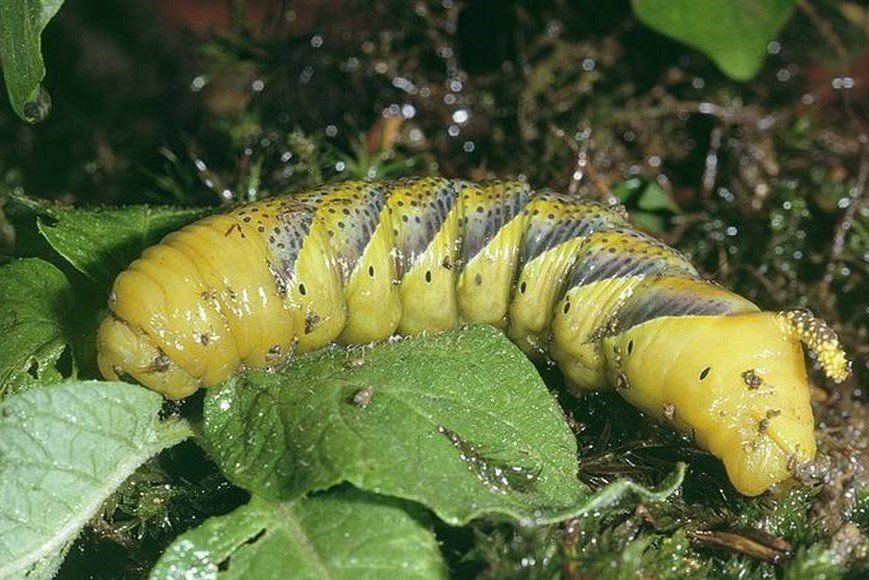 Einige von uns Schmetterlingen bevorzugen die Abende und die Nächte. Ihr Menschen nennt sie Nachtfalter. Ich habe gehört, ihr nennt die Nachtfalter auch Motten. Wir Buchenstreckfüße gehören auch dazu. Auf den Bildern unten siehst du zunächst das Kind eines Schmetterlings, den ihr Menschen als Totenkopfschwärmer bezeichnet. Sie ist mit ihrer Farbe kaum von den Blättern zu unterscheiden, deshalb ist sie nicht so leicht von Vögeln und anderen Räubern zu entdecken.