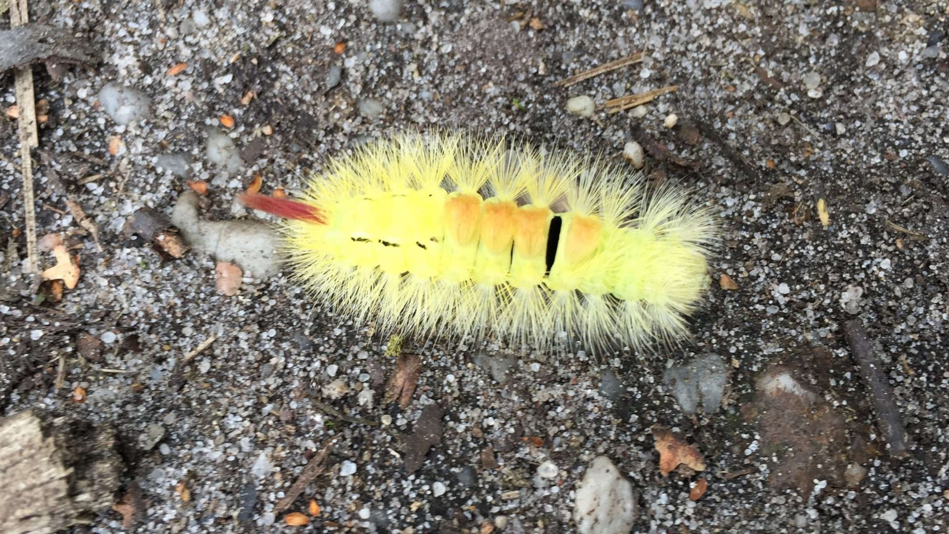 Zum Schluss möchte ich dir noch meine Cousine vorstellen. Bei den Raupen des Buchen-Streckfuß gibt es manche, die wie ich gelb gefärbt sind und andere, die braunrot werden.