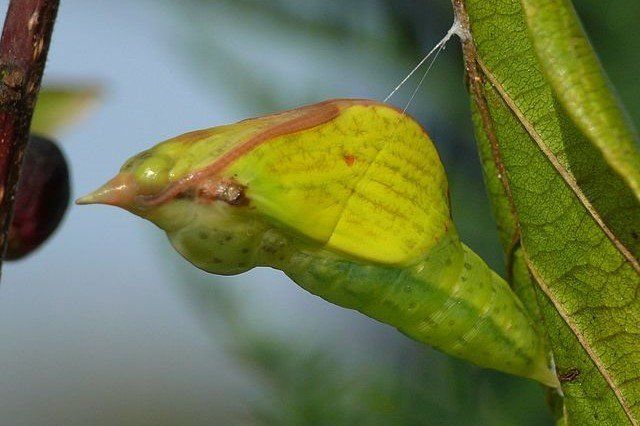 Sie frisst nicht und sie bewegt sich nicht. Manche Puppen verbringen sogar den kalten Winter in ihrem Kokon. Sie können einige Monate ohne Nahrung auskommen. Die Puppe des Zitronenfalters auf dem Bild unten hängt schon einige Zeit an einem "seidenen Faden". Sie befindet sich im Puppenstadium, das 1 bis 4 Wochen dauern kann.