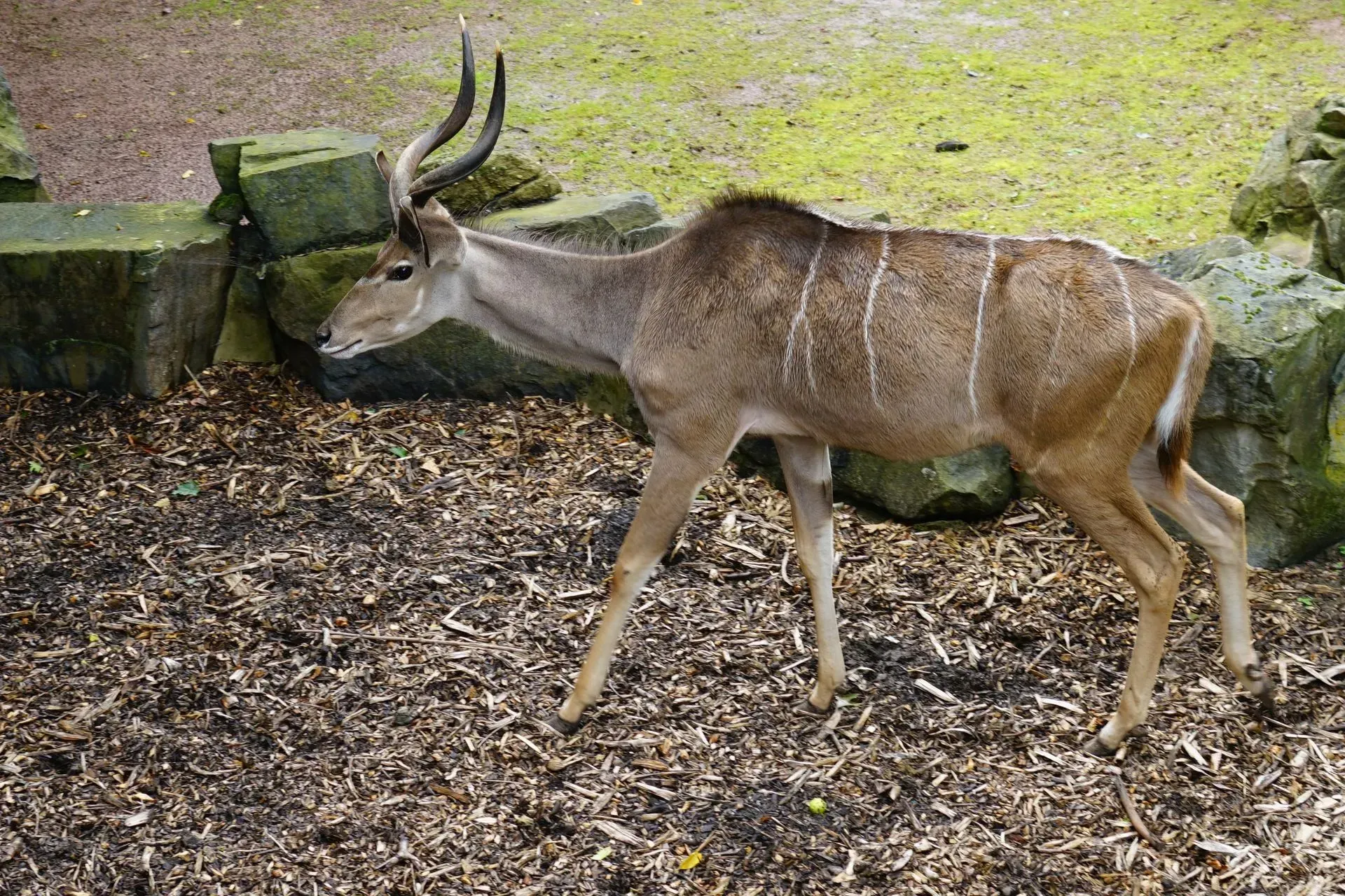 Das Fell der Kudus ist hellgrau, auf dem Rücken tragen Kudus einen weißen Längsstreifen und mehrere Querstreifen. Die Männchen haben Hörner in Form von Spiralen.