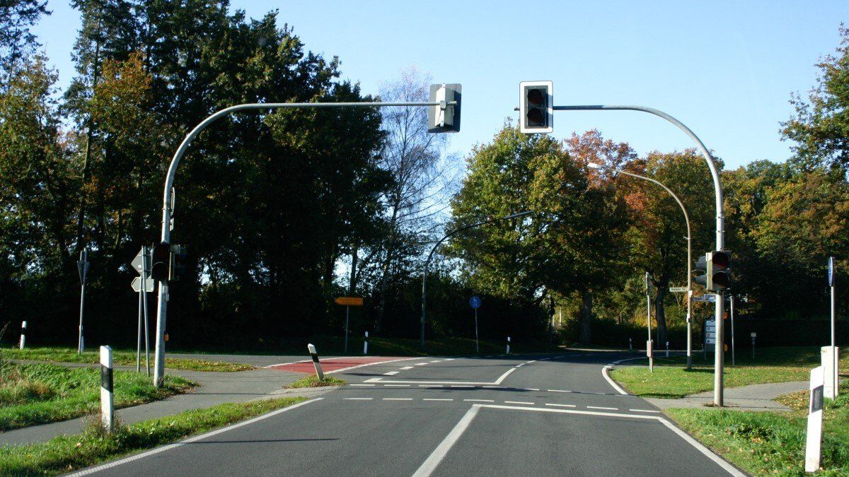 Auf dem Bild siehst du zwar eine Ampelanlage, aber kein Lichtzeichen. Die Ampel springt nur dann an, wenn vorher ein Fußgänger oder ein Radfahrer auf einen Signalknopf gedrückt hat. Man nennt eine solche Anlage auch "Dunkelampel". An einer Dunkelampel musst du sehr vorsichtig sein. Drücke immer den Signalknopf und warte auf "grün". Du darfst die Straße außerdem erst dann überqueren, wenn du sicher bist, dass heran nahende Autos wirklich anhalten. Schilder, die auf eine Dunkelampel hinweisen, gibt es nicht.