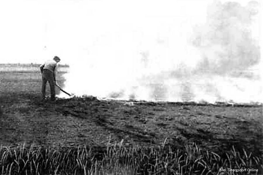 Dann stellte man einzelne Torfstücke in Haufen auf und zündete sie an. Die brennenden Stücke warf man über das Feld. Die Torfschicht geriet in Brand und schwarze Rauchwolken bedeckten den Himmel. Schließlich erlosch das Feuer von selbst, denn der Boden in der Tiefe war feucht. Die fruchtbare Asche ließ man abkühlen und säte Buchweizen hinein.