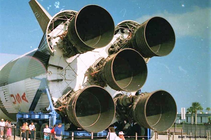 Um zwei Menschen auf den Mond und wieder zurück zu bringen, war ein großer Aufwand nötig. Die Amerikaner hatten dazu eine gewaltige Rakete entwickelt, von der nur wenige Exemplare gebaut wurden. Man nannte sie "SATURN V". Sie war insgesamt 110,6 m hoch.