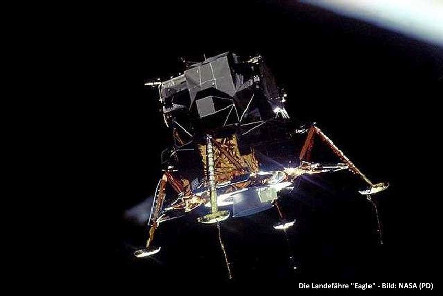Nachdem die Umlaufbahn um den Mond erreicht war, stiegen die Astronauten Armstrong und Aldrin in die Landefähre "Eagle" um. Nach dem Umstieg wurde "Eagle" von der "Columbia" getrennt. Collins blieb allein darin zurück. Nur Armstrong und Aldrin schwebten der Oberfläche des Mondes entgegen.
