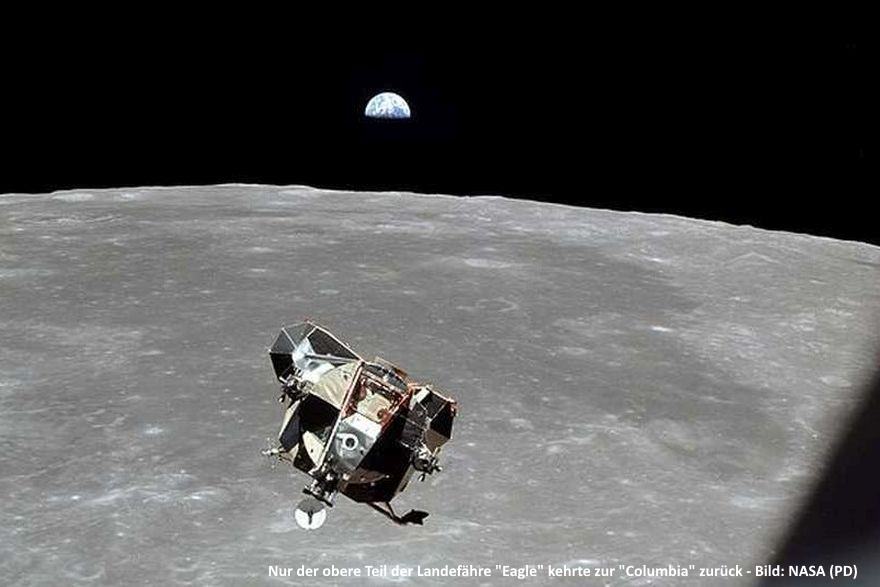 Anschließend begann ein weiterer, ungemein spannender Teil des Fluges: Die Rückkehr zur "Columbia". Der untere Teil der Landefähre blieb auf dem Mond zurück. Sie diente als Plattform für den Start. Das Triebwerk wurde gezündet.