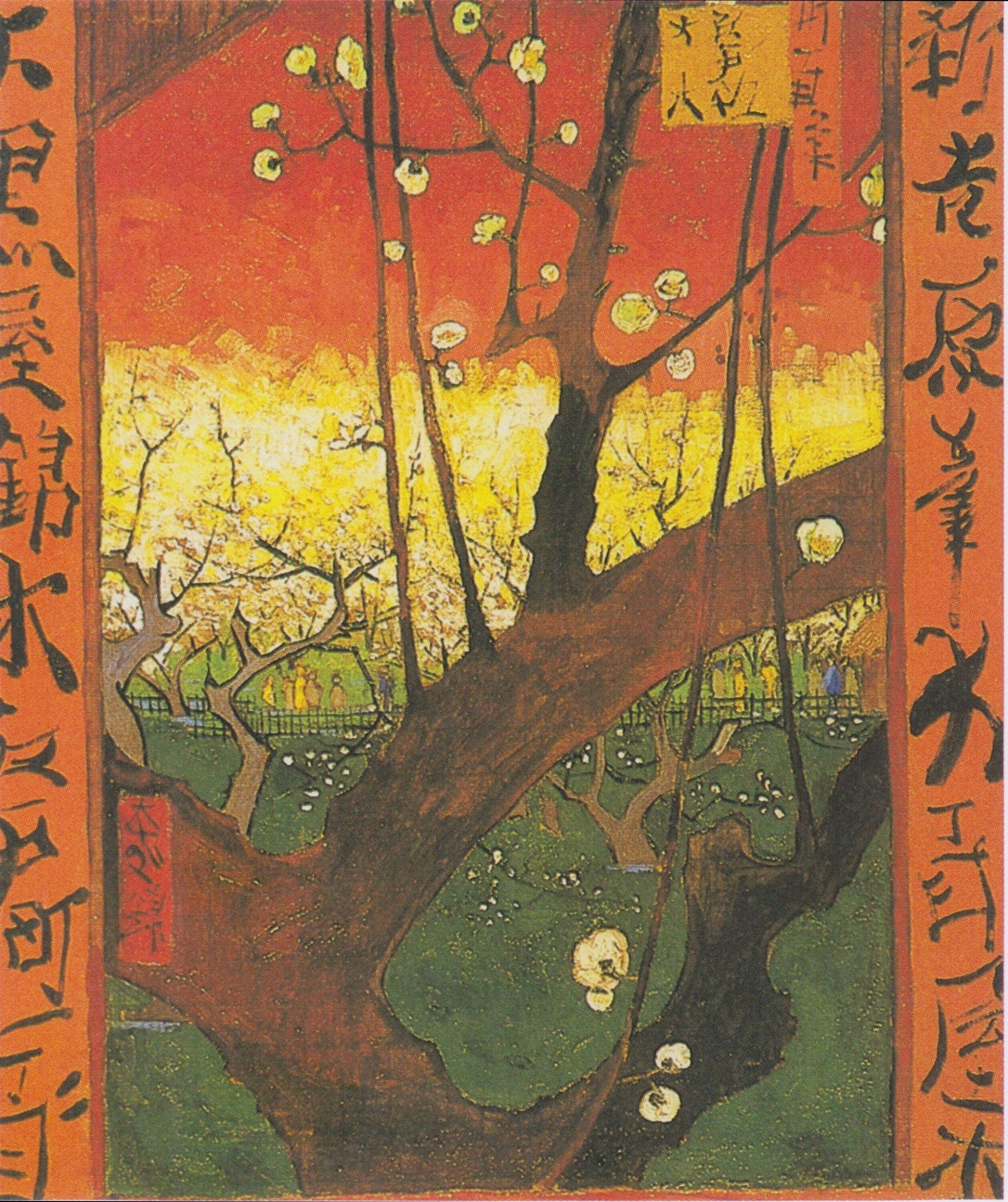 5 - Im Jahr 1886 zog Vincent van Gogh nach Paris. Dort lernte er viele andere Maler und andere Stilrichtungen kennen. Er begann, sich für japanische Bilder zu interessieren und im japanischen Stil zu malen. Das Bild "Blühender Pflaumenbaum" (5) schuf Vincent van Gogh im Jahr 1887 in Paris. Er arbeitete dabei mit Ölfarben, die er auf eine Leinwand auftrug. An den Rand des Bildes schrieb er den Namen und die Adresse eines Hauses in der japanischen Hauptstadt Tokio.