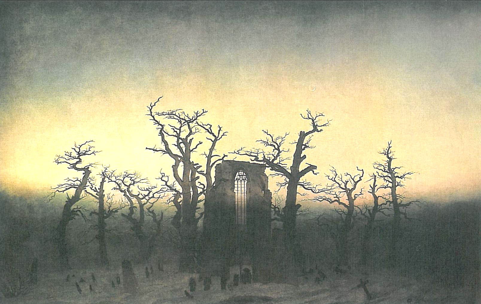 Mönche gehen in Richtung der Ruine eines Kirchenportals. Einige von ihnen tragen einen Sarg. Im Vordergrund erkennt man ein geöffnetes Grab und mehrere Kreuze. Das untere Drittel des Bildes liegt im Dunkeln. Die Sonne erhellt nur den oberen Bereich der Ruine und der kahlen Eichen. Am Himmel steht die Sichel des Mondes.