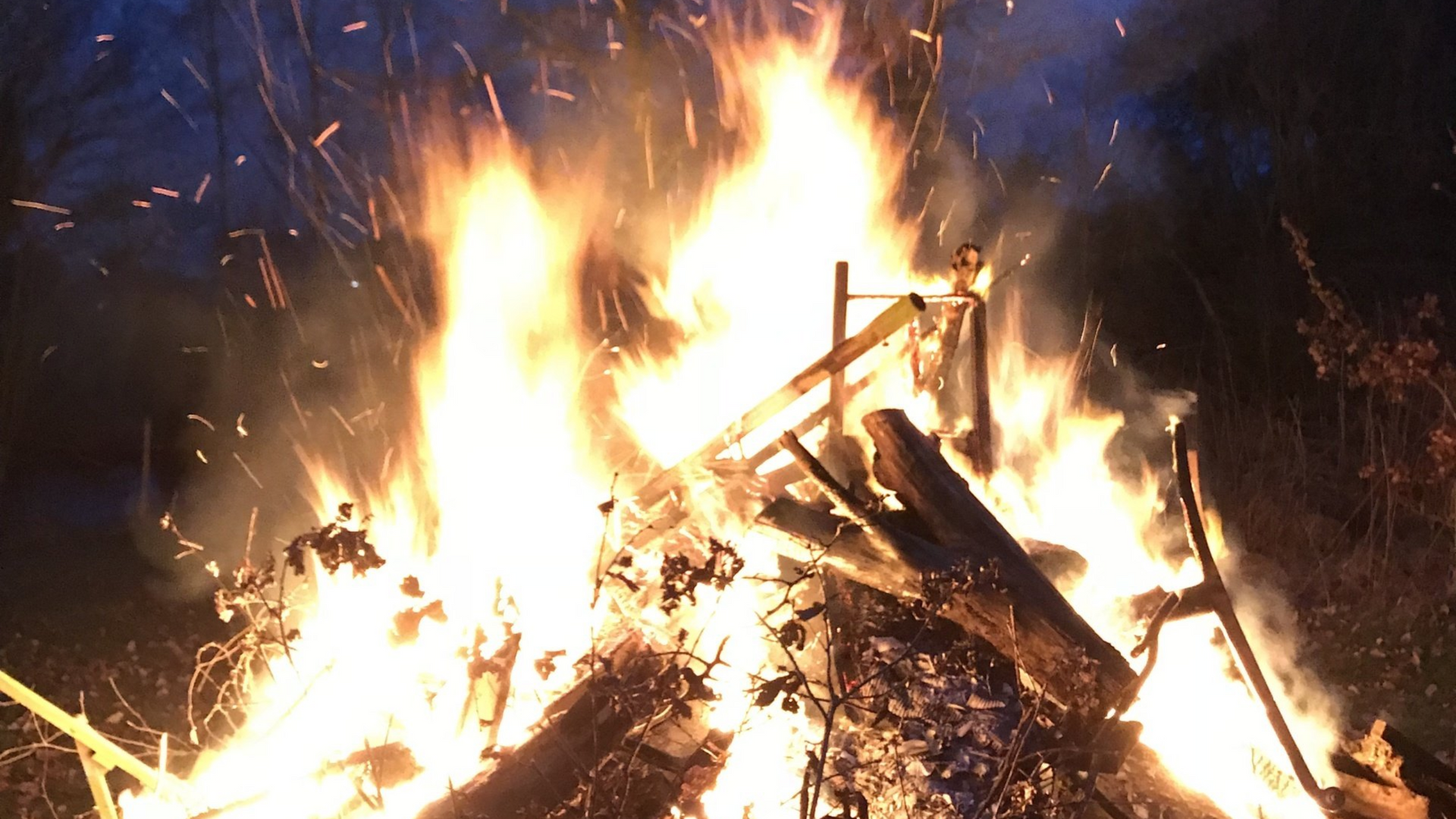 Sobald das Stroh brennt, wird es sicher Zeit, es zu Boden zu werfen. Mit Spänen, Rinde, Zweigen und Ästen kann man das Feuer weiter in Gang halten. Man kann es zum Beipiel zu einem großen Lagerfeuer werden lassen oder Stockbrot schön knusprig backen.