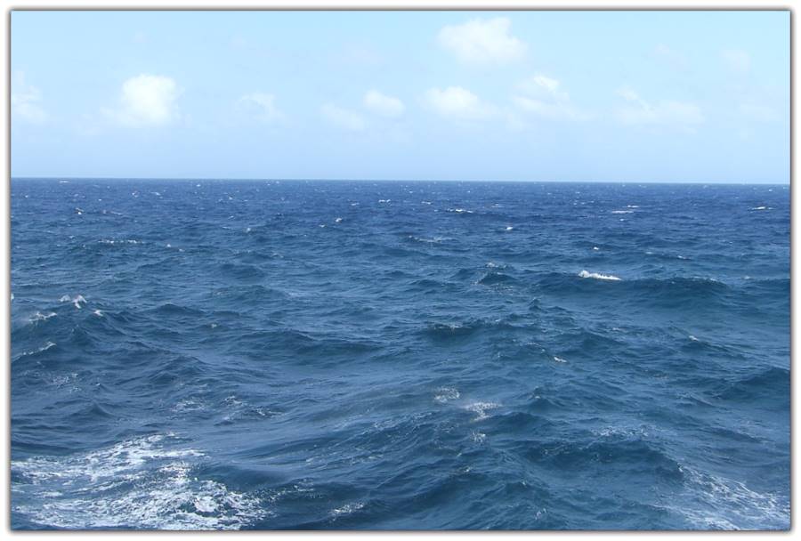 Alles beginnt über dem Meer. Die Sonne erwärmt das Wasser. An der Oberfläche setzt die Verdunstung ein. Es bildet sich feiner Wasserdampf. Das Salz im Meerwasser verdunstet nicht, es bleibt im Meer zurück.