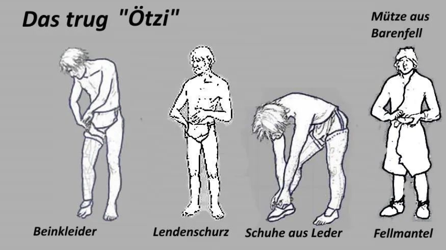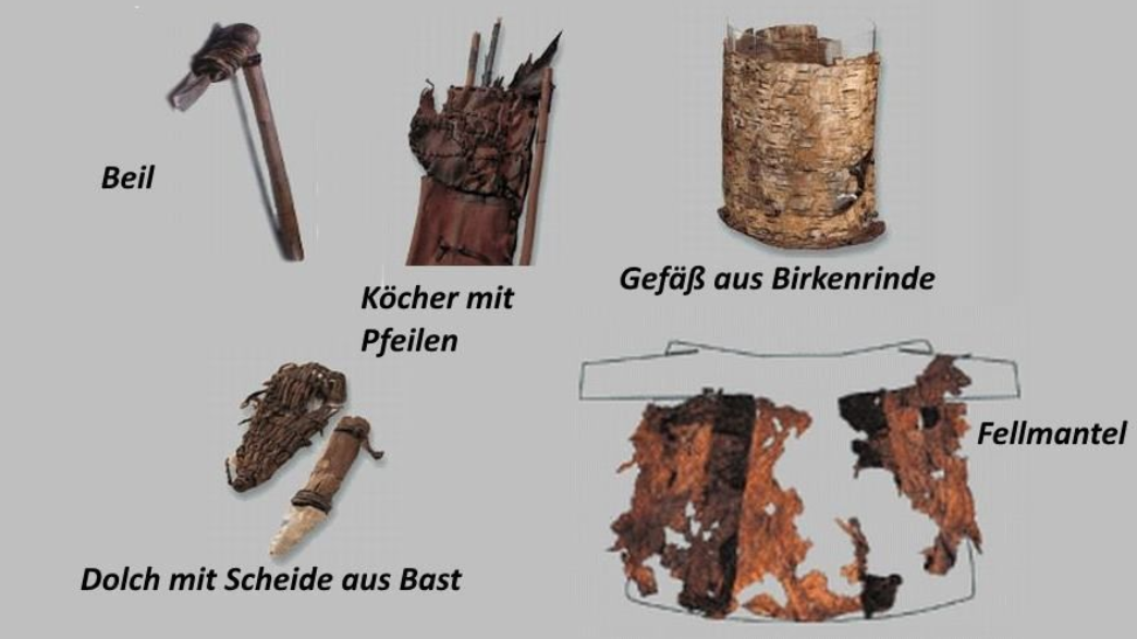 Man hat noch einige Reste seiner Bekleidung gefunden. Auch sie wurden durch das Eis und die Kälte konserviert. Und daher wissen wir, dass der Mann aus dem Eis eigentlich schön warm angezogen war.
