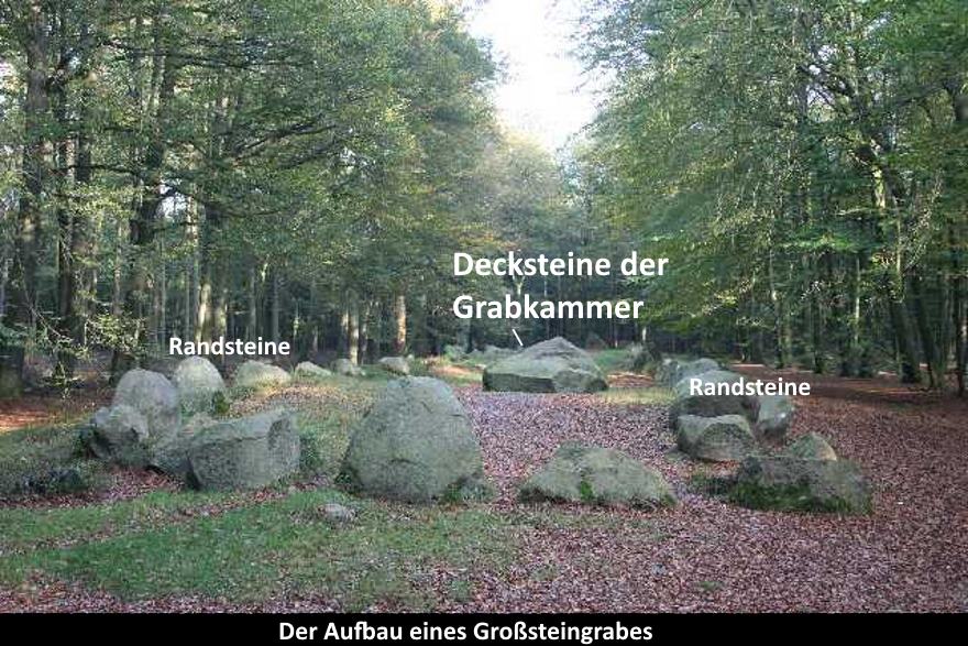 Ein solches Großsteingrab besteht zunächst aus Tragsteinen, die in die Erde eingelassen waren und aufrecht standen. Auf diese Tragsteine wurden große Decksteine gelegt. Dadurch entstand ein niedriger Raum, der die eigentliche Grabkammer bildete.