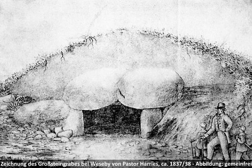 Ein Pastor zeichnete im Jahr 1837 das Großsteingrab Weseby in der Gemeinde Hünten in Schleswig-Holstein. Die Grabkammer bestand aus zwei Decksteinen und einer unbekannten Zahl von Tragsteinen. Die Anlage in Weseby gibt es heute nicht mehr. Es sind leider nur noch wenige Großsteingräber erhalten geblieben.