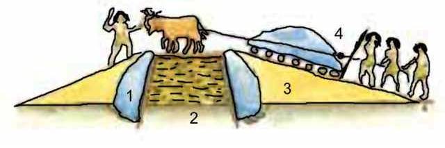 Schließlich schüttete man aus Erde oder aus vereistem Schnee seitliche Rampen auf (3). Danach konnten die Ochsengespanne die Decksteine an ihre vorgesehenen Stellen ziehen. Vermutlich hat man dabei Rollen untergelegt (4).