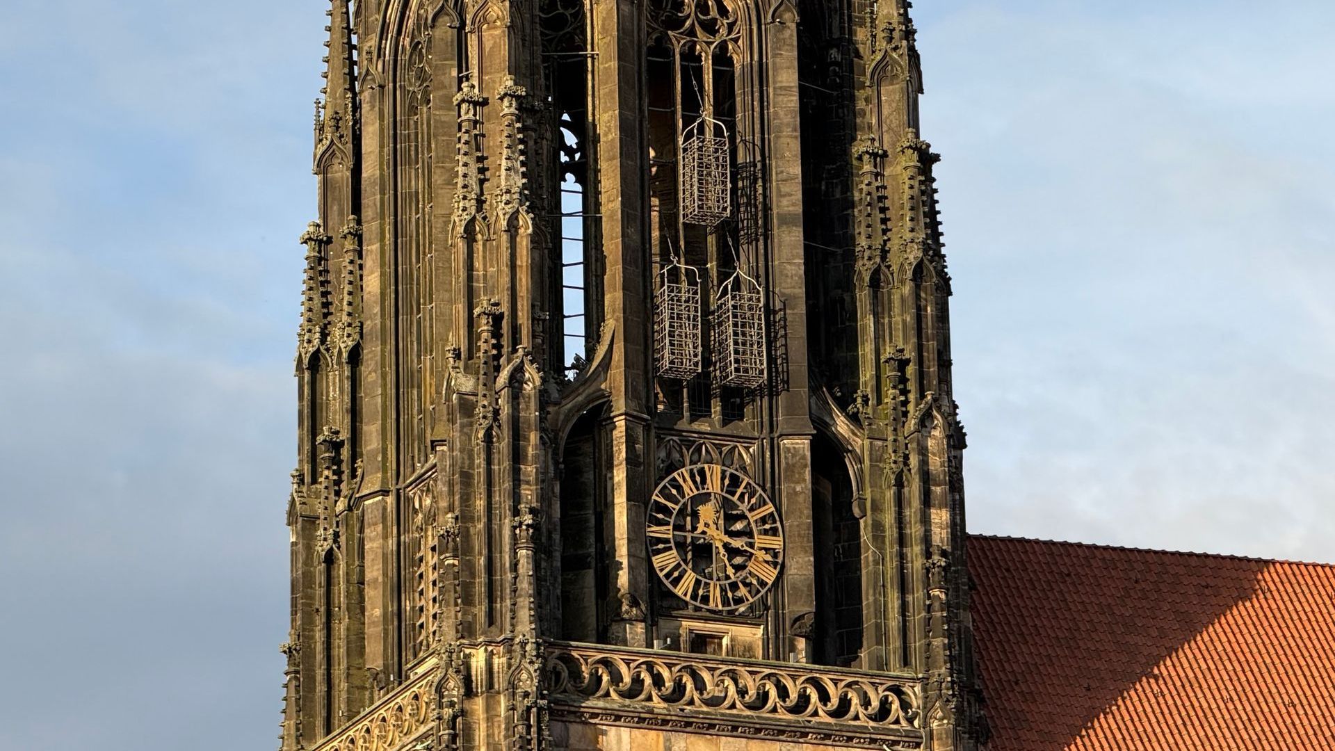 Am Turm der Lambertkirche in Münster hängen diese Käfige