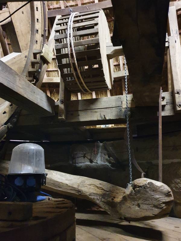 Über das Kammrad wurden zwei Mühlsteine angetrieben, die sich gegeneinander drehten. In diese Steine waren Rillen gehämmert. Die Getreidekörner wurden von den Mühlsteinen zermahlen und das Mehl in Säcken aufgefangen. Mit einem Bremsbalken konnte die Mühle abgebremst werden.
