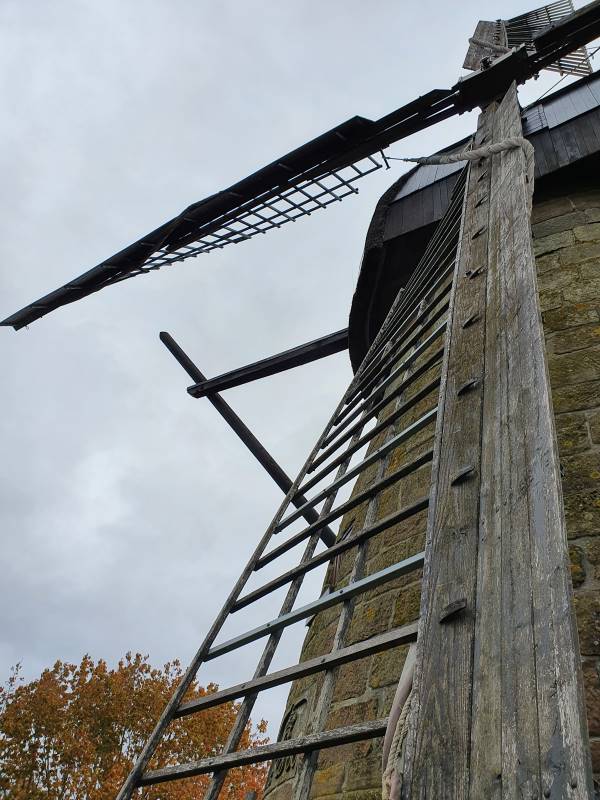 Die Windmühle steht noch heute und ist ungefähr 13 Meter hoch. Der Wind drehte ihre vier Flügel, die mit Stoff bespannt waren, um die Kraft des Windes besser ausnutzen zu können. Im Inneren befand sich eine graue Flügelwelle und ein großes Rad aus Holz, das man Kammrad nennt. Die Flügelwelle ragte mit ihrem Kopf aus der Mühlenkappe heraus und nahm die Kräfte von den Flügeln auf.