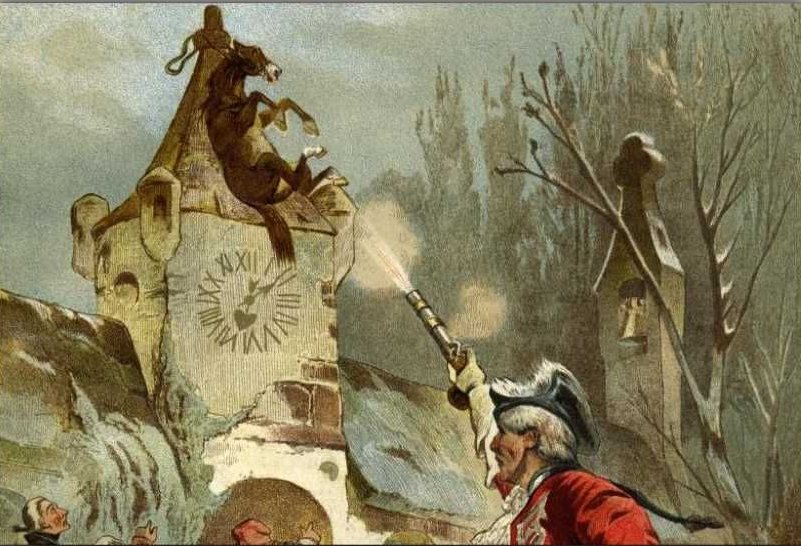 Wie groß war aber mein Erstaunen, als ich am nächsten Morgen fand, dass ich mitten in einem Dorf auf dem Kirchhofe lag! Die Sonne schien, aber mein Pferd war anfänglich nirgends zu sehen; doch hörte ich es bald irgendwo über mir wiehern. Als ich nun empor sah, bemerkte ich, dass es an den Wetterhahn des Kirchturms gebunden war und von da herunterhing. Das Dorf war nämlich die Nacht über ganz zugeschneit gewesen. Das Wetter war jedoch umgeschlagen und es hatte zu tauen begonnen. Ich war im Schlafe nach und nach ganz sanft herabgesunken.
