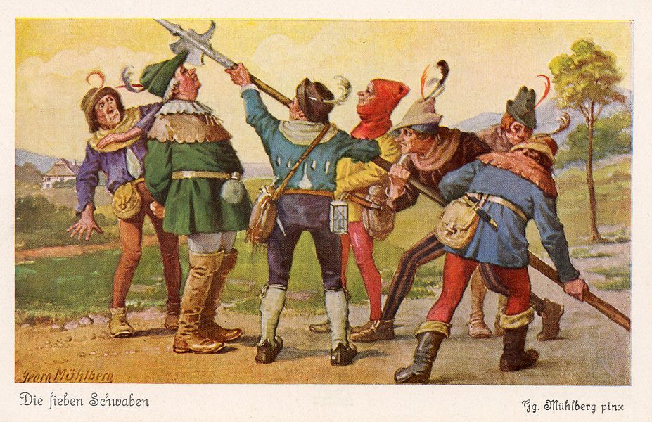 Einmal trafen sieben Schwaben zusammen, der Herr Schulz, der Jackli, der Marli, der Jergli, der Michal, der Hans und der Veitli. Sie beschlossen, durch die Welt zu ziehen und große Taten zu vollbringen. Um möglichst stark und wehrhaft zu erscheinen, ließen sie sich einen langen hölzernen Spieß machen, den sie gemeinsam trugen. Vorn ging der Herr Schulz, denn er war der kühnste von allen, am Ende lief der Veitli.
