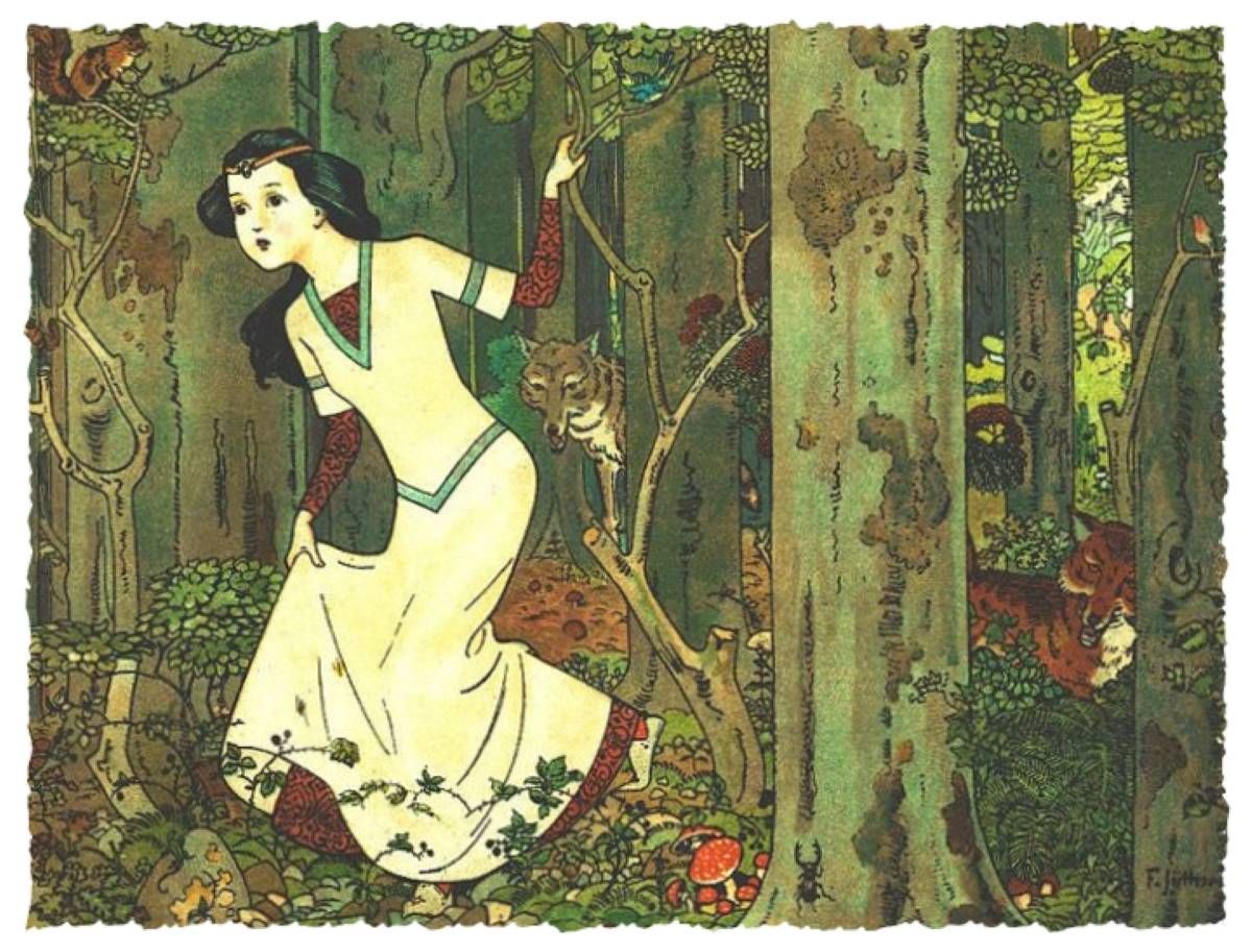 Da erschrak die Königin und wurde gelb und grün vor Neid. Sie begann, das Mädchen zu hassen. Neid und Hochmut nahmen immer mehr zu, so dass sie eines Tages einen Jäger des Königs rief und von ihm verlangte: "Bring das Kind hinaus in den Wald, ich will es nicht mehr vor meinen Augen sehen. Töte es und bringe mir Lunge und Leber zum Wahrzeichen mit."