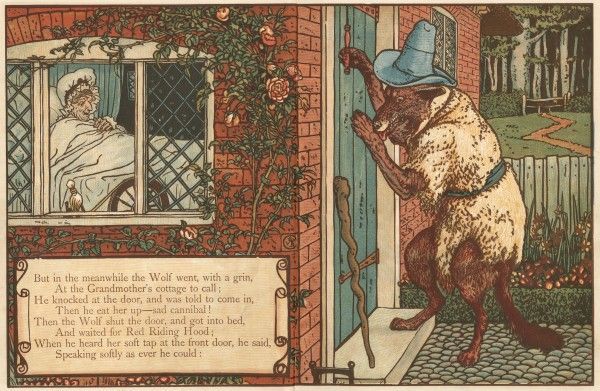 Der Wolf drückte auf die Klinke, trat ein und ging, ohne ein Wort zu sprechen, schnurstracks an das Bett der Großmutter und verschlang sie. Dann zog er ihre Kleider an und setzte ihre Haube auf. Er zog die Vorhänge zu, legte sich in ihr Bett und wartete.
