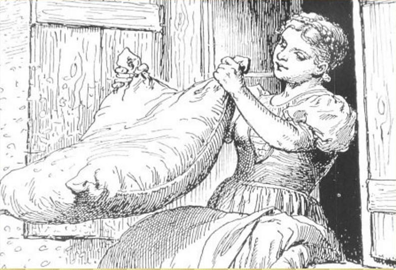 Als das Mädchen näher kam, erblickte es eine Frau mit großen, schiefen Zähnen. Ängstlich sah es die Frau an, doch diese sprach freundlich: “Hab keine Angst. Bleib bei mir. Ich könnte eine Hilfe im Haus gut gebrauchen. Wenn du deine Arbeit ordentlich machst, dann soll es dir gut gehen bei mir. Du musst nur mein Bett und die Kissen tüchtig aufschütteln, dass die Federn fliegen. Dann schneit es auf der Erde, ich bin nämlich die Frau Holle."