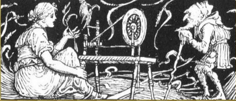 Plötzlich ging die Tür auf. Ein kleines Männchen kam herein und sprach: „Guten Abend, warum weinst du?“ Das Mädchen klagte sein Leid. Da fragte das Männchen: „Was gibst du mir, wenn ich dir helfe und alles Stroh zu Gold spinne?“ Das Mädchen versprach ihm sein Halsband. Der kleine Mann nahm das Band, setzte sich an das Spinnrad und in Windeseile waren die ersten Spulen voller goldener Fäden. So ging das bis zum frühen Morgen und ehe die Sonne aufging, war alles Stroh zu Gold gesponnen.