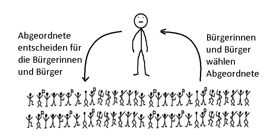 Da in einem großen Land nicht ständig alle Menschen über alle möglichen Fragen abstimmen können, werden in einer Demokratie Vertreter des Volkes gewählt, die in seinem Namen entscheiden. Sie werden für eine festgelegte Zeit bestimmt, meistens für vier oder fünf Jahre.