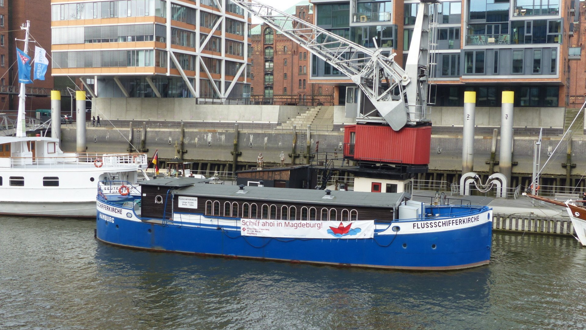 9 - Im heutigen Sandtorhafen hat man auch drei Kräne aufgestellt, mit denen Stückgut gehoben werden konnte. Im Vordergrund liegt die Flusschifferkirche, Deutschlands einziges Gotteshaus auf Schiffsplanken. Der ehemalige Frachtkahn wurde 1952 zur schwimmenden Kirche geweiht und lädt auch heute noch zum Gottesdienst auf dem Wasser ein.